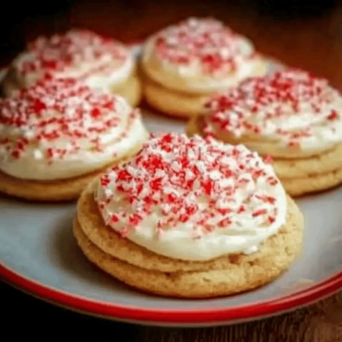 - Frost the cooled cookies and top with crushed candy canes.