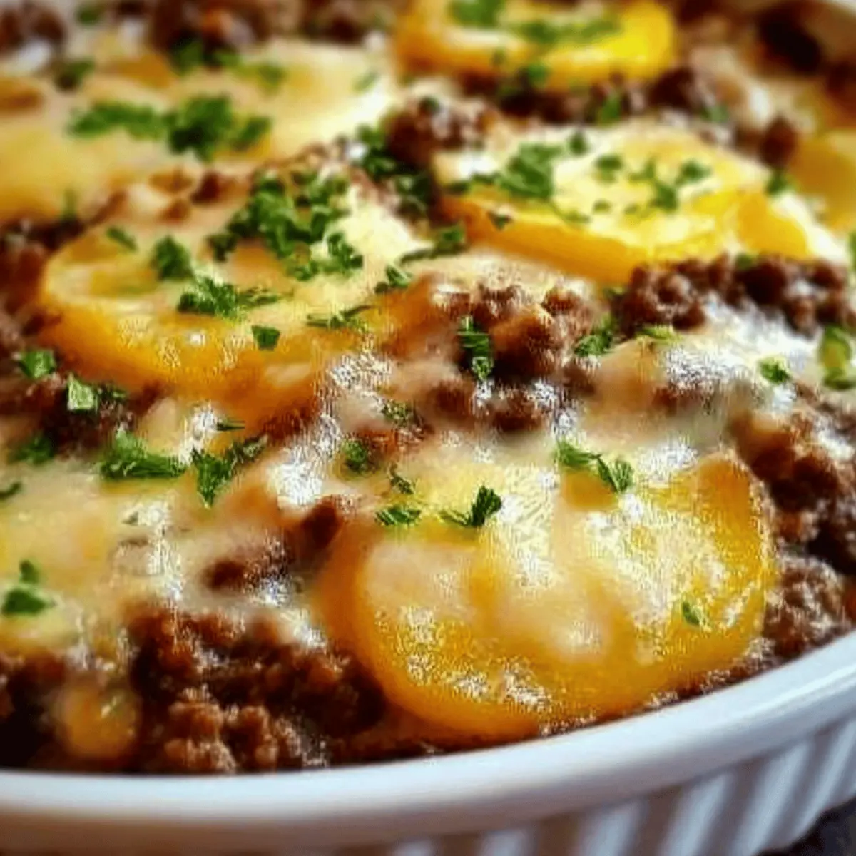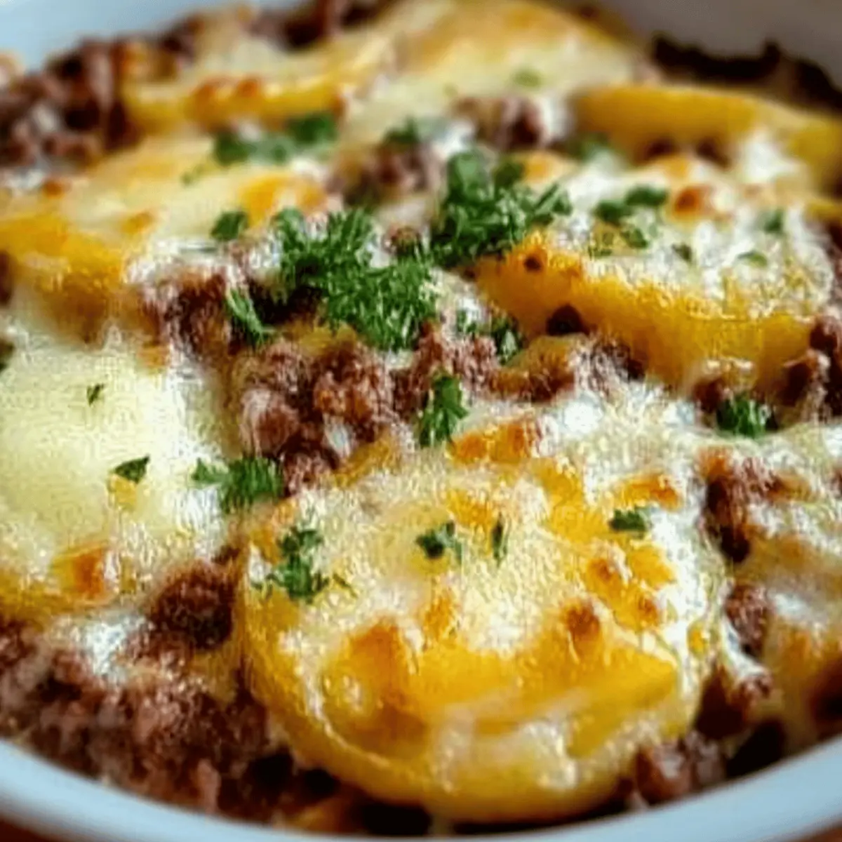 Comforting Delight: This Cheesy Potato Beef Bake combines warm, tender potatoes with a rich beef filling, offering a delightful hug in every bite.