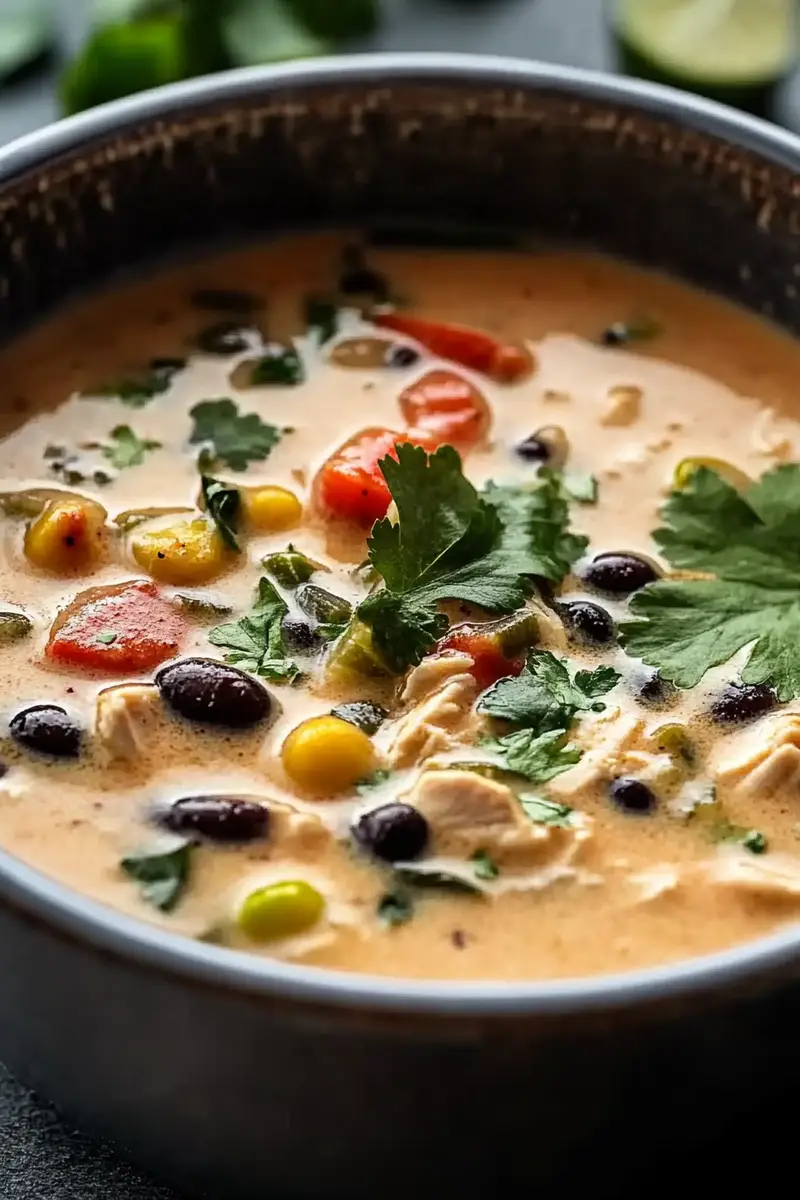 A hearty Mexican-inspired soup featuring tender chicken, roasted poblano peppers, and black beans in a creamy broth. This warming soup balances smoky heat with rich creaminess.