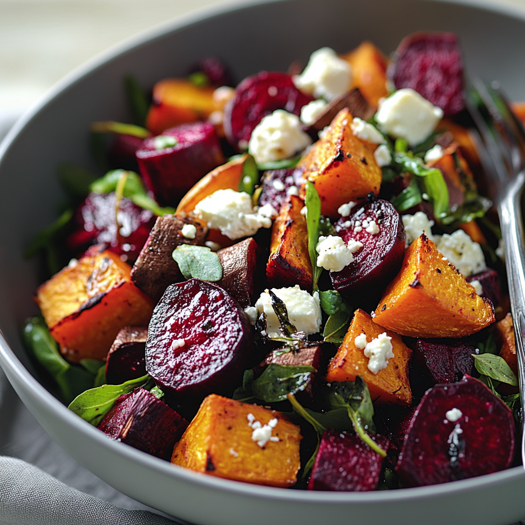 Creamy Roasted Beet Salad with Sweet Potato & Feta
