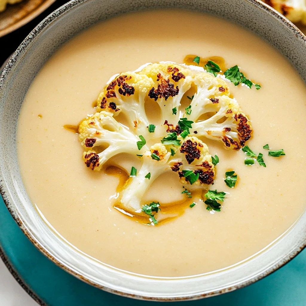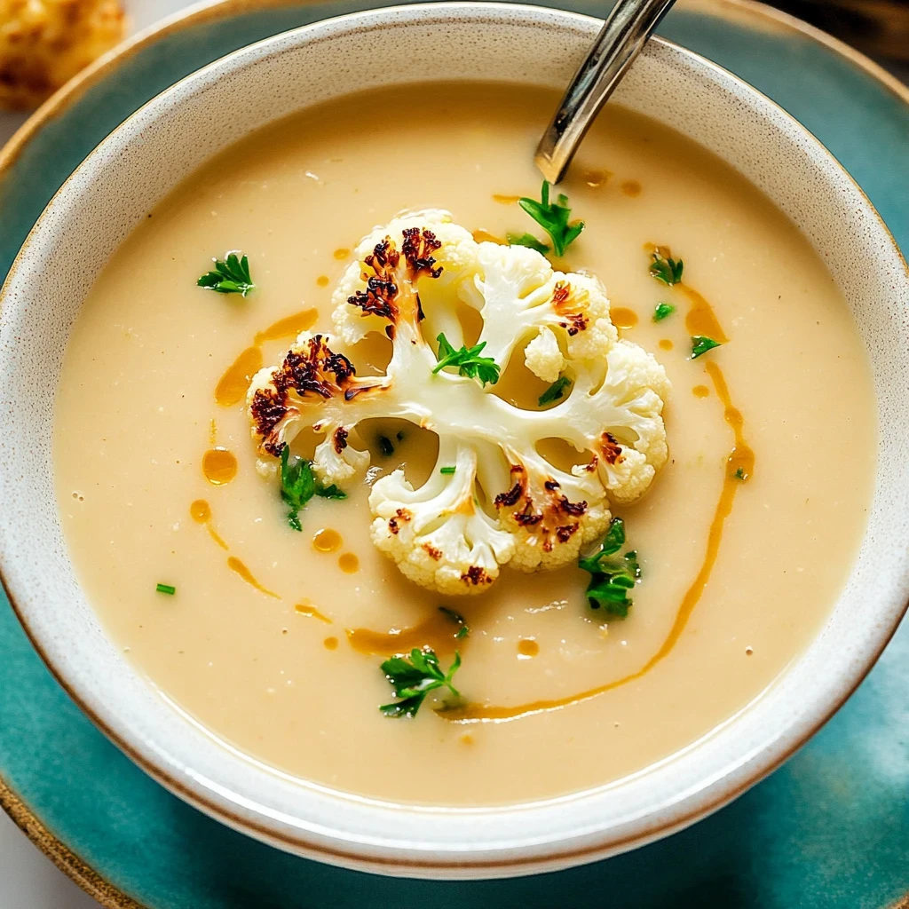 Making the Soup: While the cauliflower is roasting, take a large pot and heat it over medium heat. Add your chopped onion and minced garlic, stirring gently until they become translucent and fragrant—this aromatic combination is simply irresistible! As you sauté, keep an eye on your roasting cauliflower; those lovely caramelized edges are essential for flavor. Once your onion and garlic have reached that perfect stage, it’s time to introduce the star of our dish: carefully add the roasted cauliflower into the pot along with two cups of vegetable broth. Let this simmer for just a few moments; you’ll notice the delightful melding of flavors. After simmering, remove the pot from heat and let cool slightly before blending. If you have an immersion blender, this is a perfect opportunity; otherwise, transfer everything carefully to a regular blender for that smooth texture we all love! Blend until silky smooth, then stir in one cup of coconut milk or heavy cream for added richness. Taste and adjust seasoning as needed; a little extra salt or pepper can elevate your soup’s flavor to perfection! Finally, heat through just before serving—your kitchen will be filled with an enticing aroma that promises warmth and comfort with every spoonful.