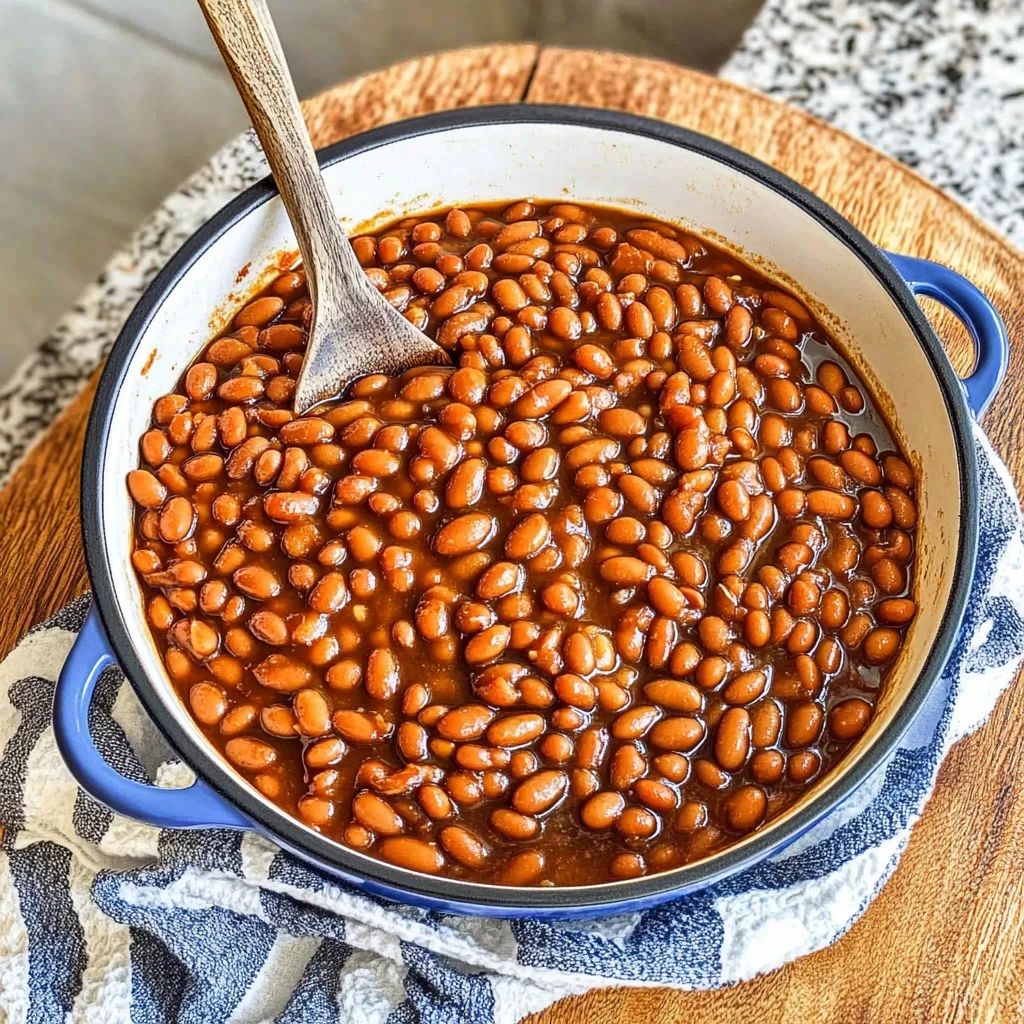 A hearty and flavorful dish made with dried beans, cooked slowly with a blend of spices and sweeteners for a comforting meal.