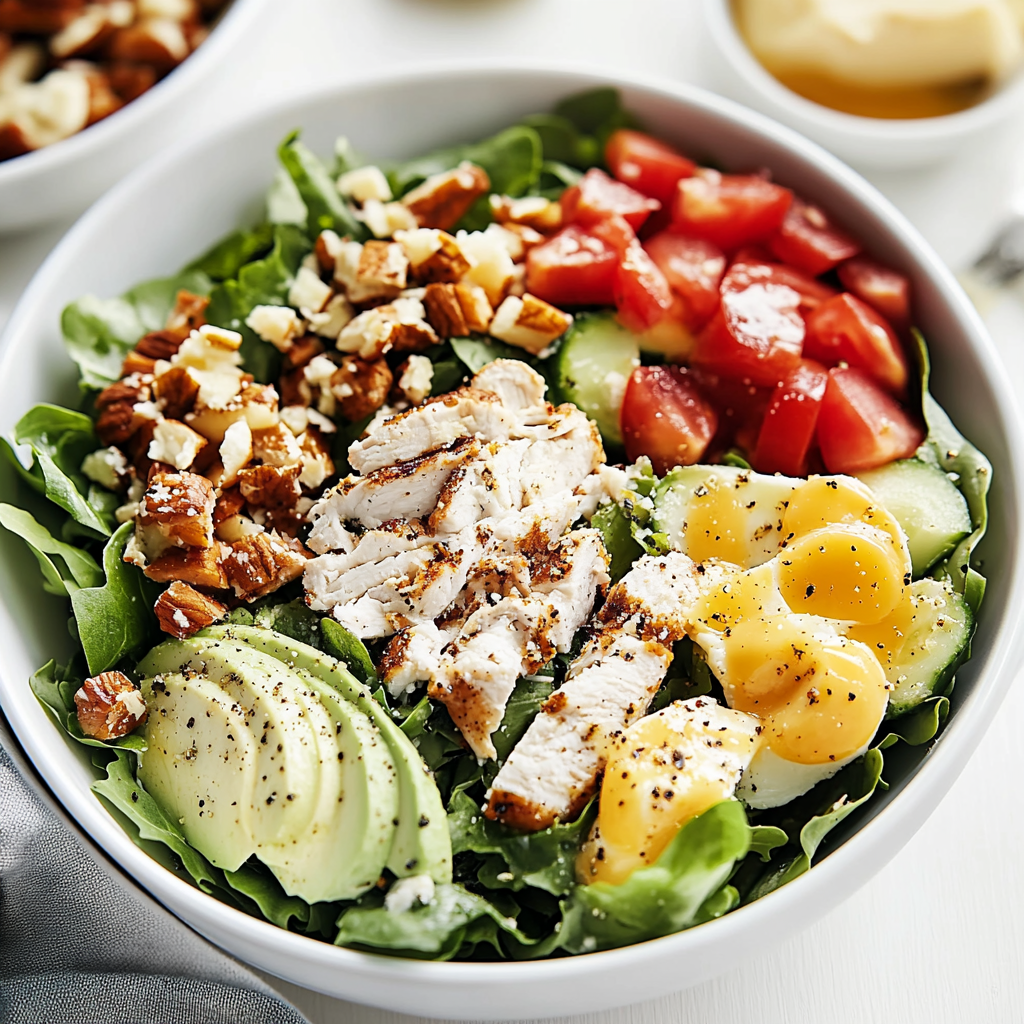 Cobb Salad is a vibrant and satisfying dish that brings together an array of fresh ingredients, delightful textures, and bold flavors. This classic salad features layers of crisp romaine lettuce, juicy tomatoes, creamy avocado, tender grilled chicken, crispy bacon, and rich blue cheese, all drizzled with a zesty red wine vinaigrette. Each bite bursts with flavor, making it perfect for any occasion—from casual picnics to elegant dinner parties. Not only is it visually appealing, but it is also highly customizable to suit various tastes and dietary preferences. Enjoy the perfect blend of nutrition and taste in this iconic salad that is sure to impress your guests or elevate your lunch at home.