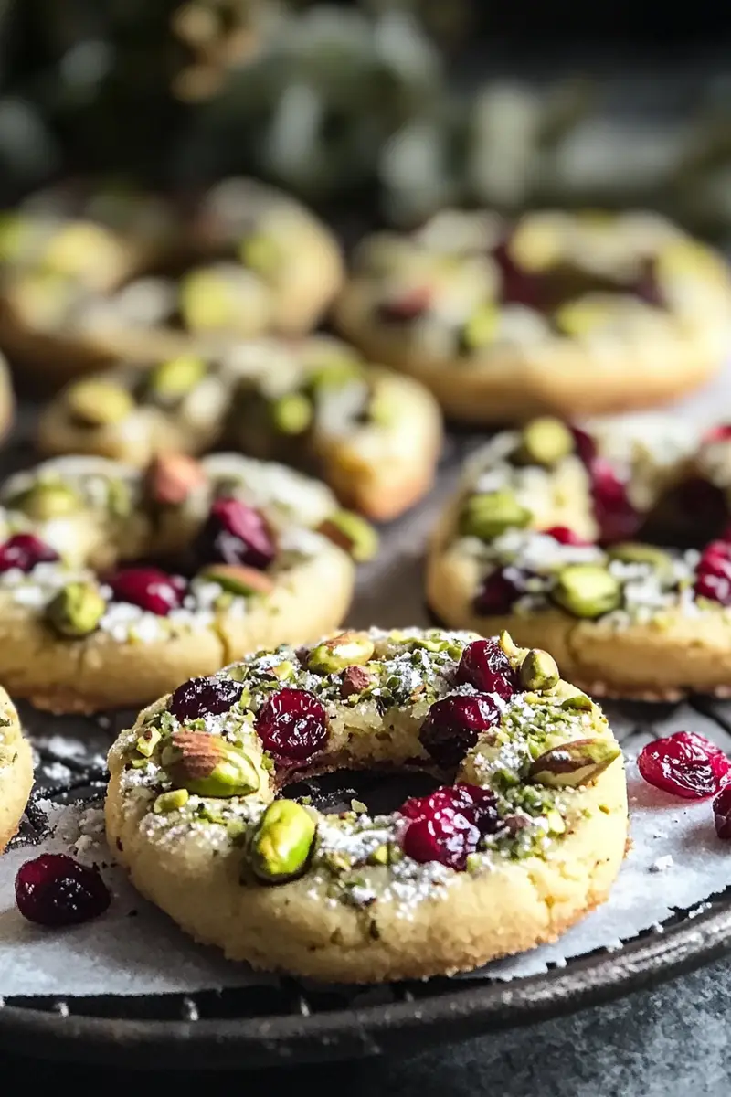 A festive and elegant holiday cookie featuring a buttery shortbread base adorned with pistachios and dried cranberries, shaped into charming wreaths that are perfect for gifting or holiday gatherings.