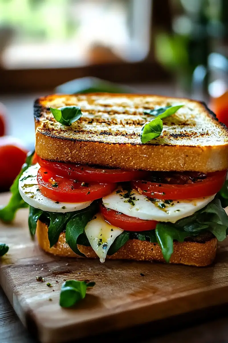 A classic Italian-inspired sandwich featuring layers of fresh mozzarella, ripe tomatoes, and fragrant basil, drizzled with balsamic glaze and extra virgin olive oil. Perfect for a light lunch or summer picnic.