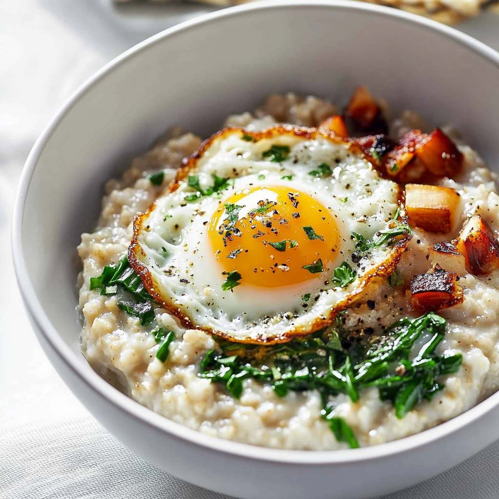 In summary, Savory oatmeal with fried egg is a nourishing meal that brings together healthy oats and protein-rich eggs for a complete breakfast experience. Pairing it with toppings like avocado or leafy greens boosts both flavor and nutrition. The versatility of this dish allows you to customize it based on what you enjoy most or have on hand. Whether you’re looking for something quick during busy mornings or a satisfying brunch option, this recipe delivers great taste and energy-boosting benefits in every bite. Enjoy experimenting with different toppings and flavors while savoring each delicious spoonful!