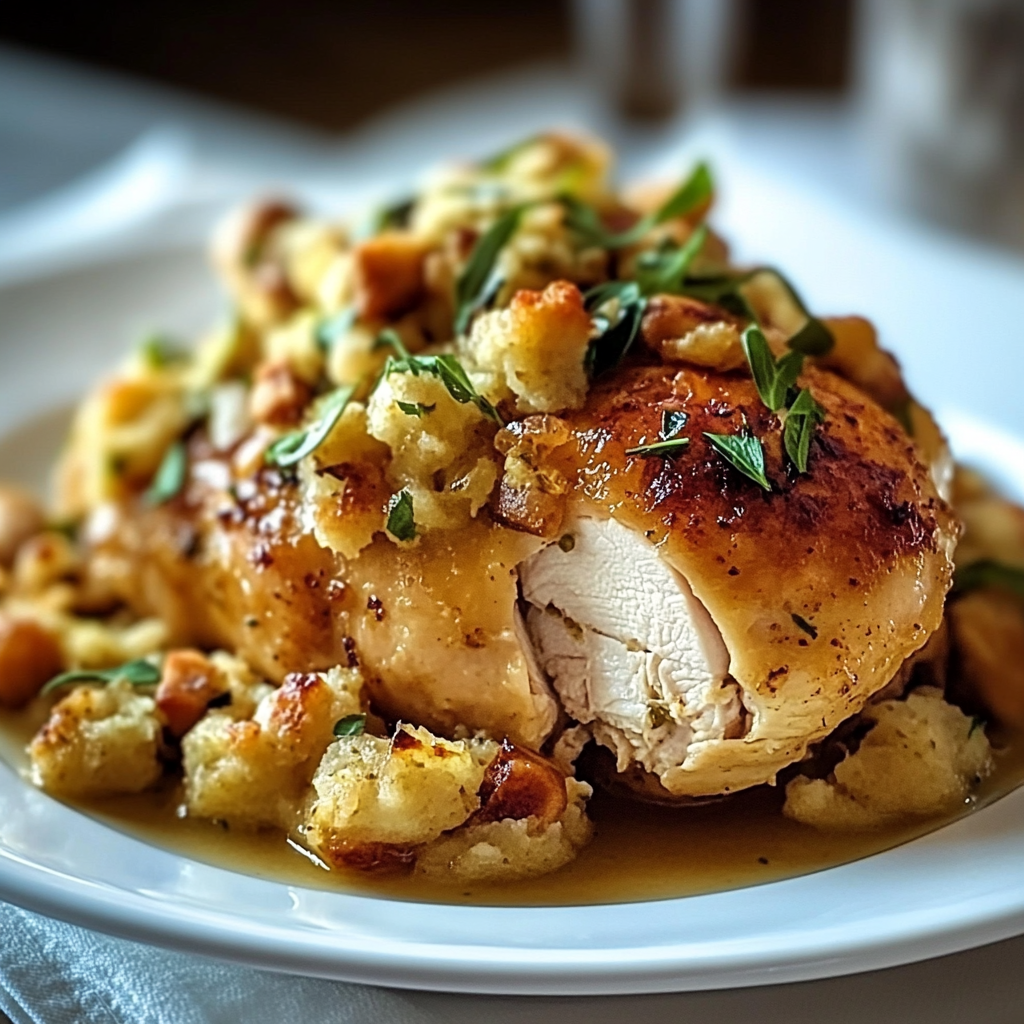 Crown Your Chicken with Stuffing: Gently spoon the stuffing mixture over the chicken breasts, covering them completely like a fluffy cloud.