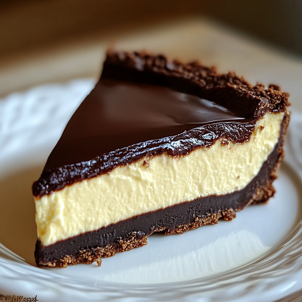 Indulge in a rich and creamy Boston chocolate cream pie cheesecake, featuring a luscious chocolate ganache topping over a velvety cheesecake filling. Perfect for any occasion.