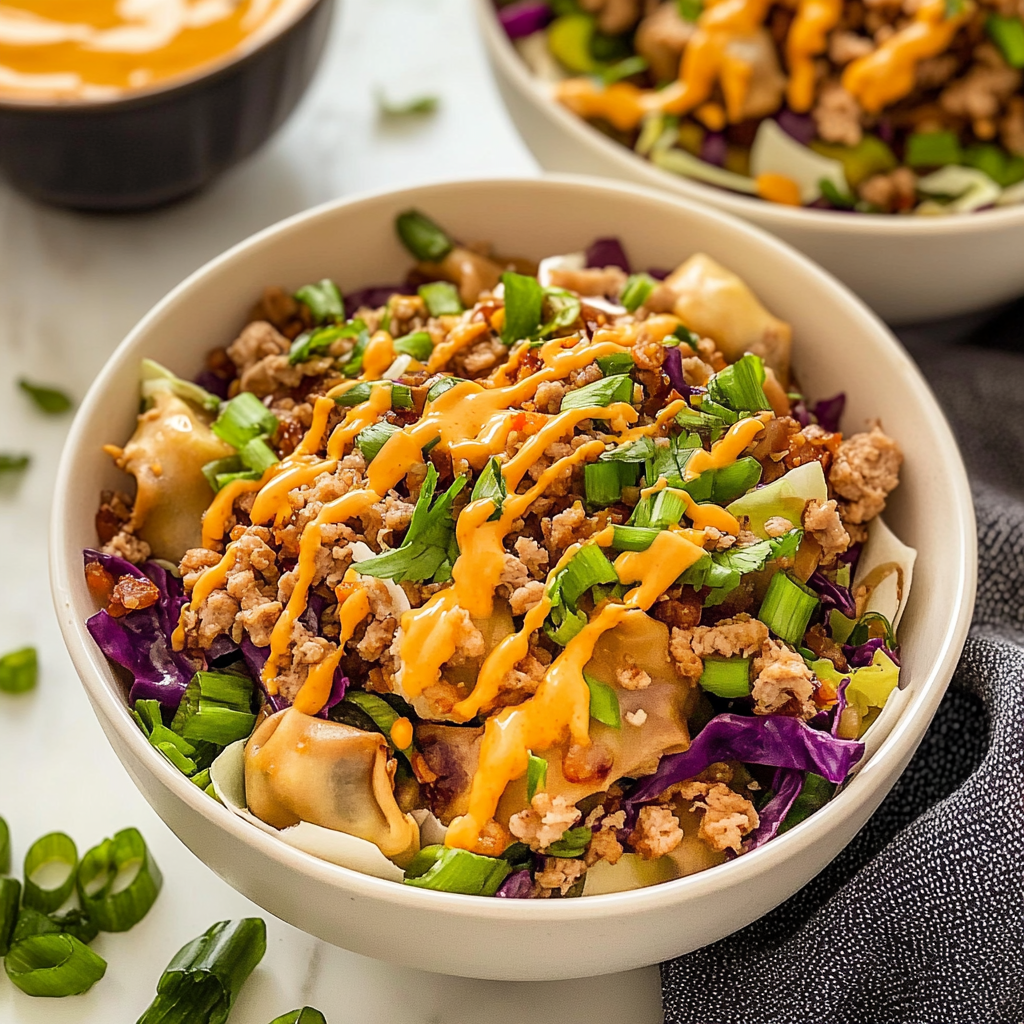 Delicious Egg Roll in a Bowl with Creamy Chili Sauce
